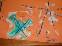 Leanna asked her Dad for some of his scrap wood and designed a playground (the one on the table). Pictured are her and Justin's projects drying (they glued them with wood glue, although I doubt all the pieces will stay together). Although I look at Justin's project and see a rifle, he tells me it's an airplane. Timothy just played with his, useing them like blocks.